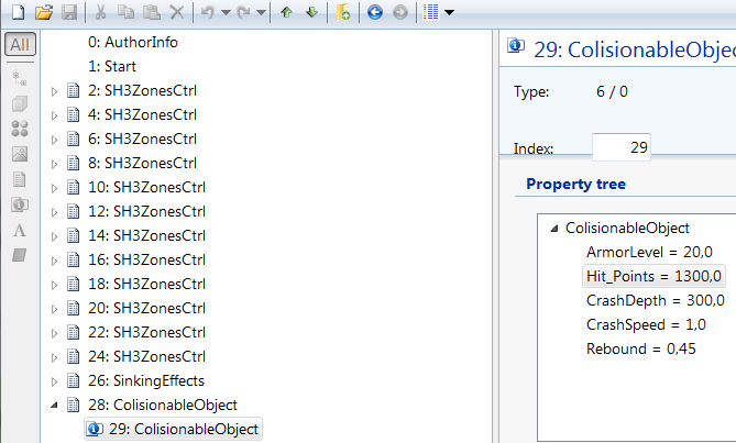Сфера-невидимый в игре компонент zon-настроек ТТД корабля. Торпеда(снаряд),проходя в игре сквозь сферу активируется,и наносит судну ущерб. Если сферы нет(либо она размещена бестолково),то снаряд(торпеда),попадая в бессферную часть судна проскакивает сквозь судно,как по пустому месту. Ущерб,в свою очередь,вычисляется из многих связующих параметров,учитывая абсолютно всё: количество Hit_Points и ArmorLevel (прописанных в контроллере ColisionableObject файла zon.судна,принцип работы которого,в свою очередь,занесен в соответств.*act,*dll,количество отнимаемых у этого судна значений за один «присест»,прописанное снарядам и торпедам,интервал времени,за который расходуются эти значения(*act,*dll),который в зависимости от результатного вычисления значений процессов Hit_Points и ArmorLevel может меняться от нескольких минут до нескольких часов. По принципу течения жидкости различной степени плотности. Масло(вязкость)течёт дольше,чем обычная вода. Здесь тоже самое. Чем меньше урон,тем дольше судно может тонуть,и в конечном счете,сей процесс может и вовсе остановиться,ежели полученных после повреждения значений не хватило для полного потопления(тогда готовьте еще торпеду). Также вступают в работу Боксы разрушений и потопляемости судна(работающие по тем же принципам),которым также прописаны значения интервалов времени и интенсивности развития процессов(*act,*dll) в зависимости от типа,который указан в каждом конкретном боксе под своей определенной цифрой. Они работают сообща с вышеописанными Hit_Points и ArmorLevel. На всё это сверху влияет и погода в данный момент. Шторм частично усиливает и ускоряет все эти процессы. Все определения типов боксов расписаны в файле Zones.cfg. Например,тип 40-средний(по интенсивности)пожар. В зависимости от расположения данного бокса там же и будет возникать этот средний огонь. Тип 154- Zone type: NflotMain: Боксы этого типа ( и некоторых других типов,схожих по специфике) «прикидываются» своеобразными трюмами судна,в которые поступает вода при повреждении в его области,вызывая тем самым,имитацию крена-дифферента,боксы машинного отделения при повреждении имитируют разрушение отсеков машинных отделений,вследствие чего,судно останавливается,также боксы топливных цистерн,попадание в которые обычно провоцирует взрыв и разлом судна пополам и т.д. и т.п. Это общие принципы. В след.постах постараюсь выложить анализ правильных и неправильных настроек(для сравнений и улавливания принципа) со скринами и объяснениями по каждому. Прошу учесть,что я-не кандидат наук по программе S3D,и некоторые вопросы в нём ещё и для меня пока загадка. А рассказываю только то,что знаю. Если есть конкретные вопросы-спрашивайте,если знаю,по возможности отвечу. Если есть толковые люди,также неплохо знающие эту программу-помогайте. Но помните,что я взялся разобрать по винтику пока только настройки ZON. Если хотите дополнить по другим вопросам,выделяйте это отдельным шрифтом в начале поста,дабы избежать путаницы.