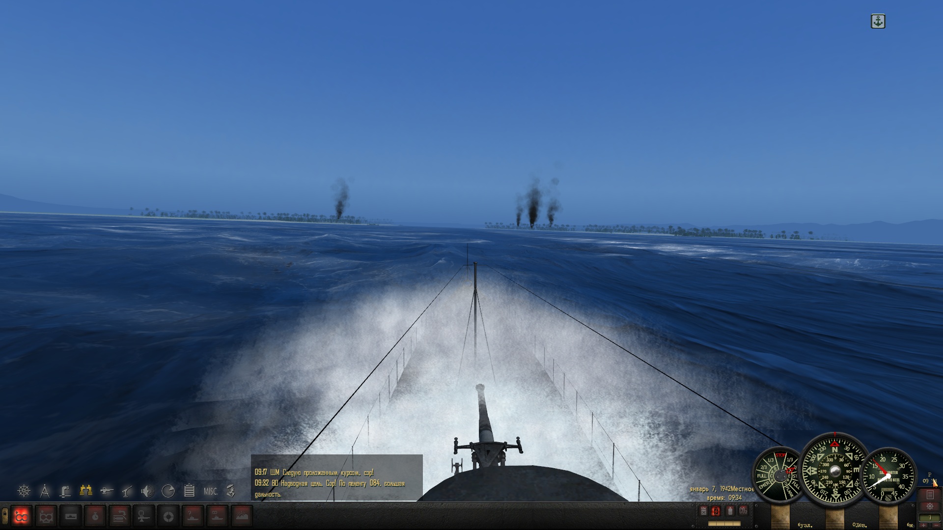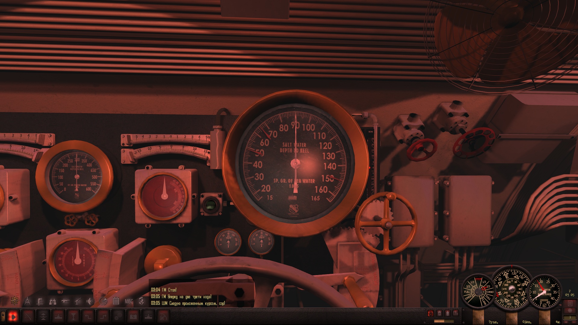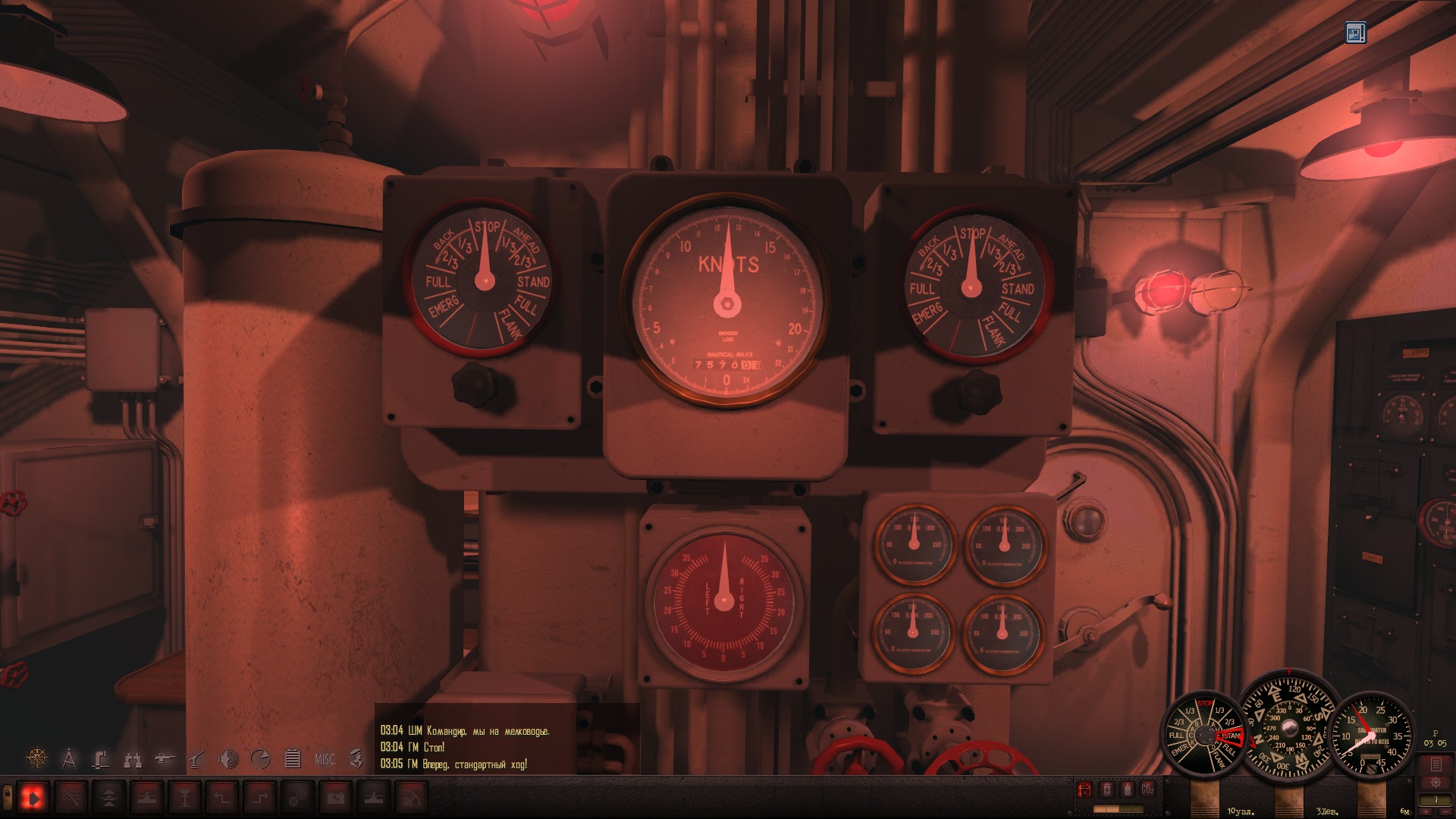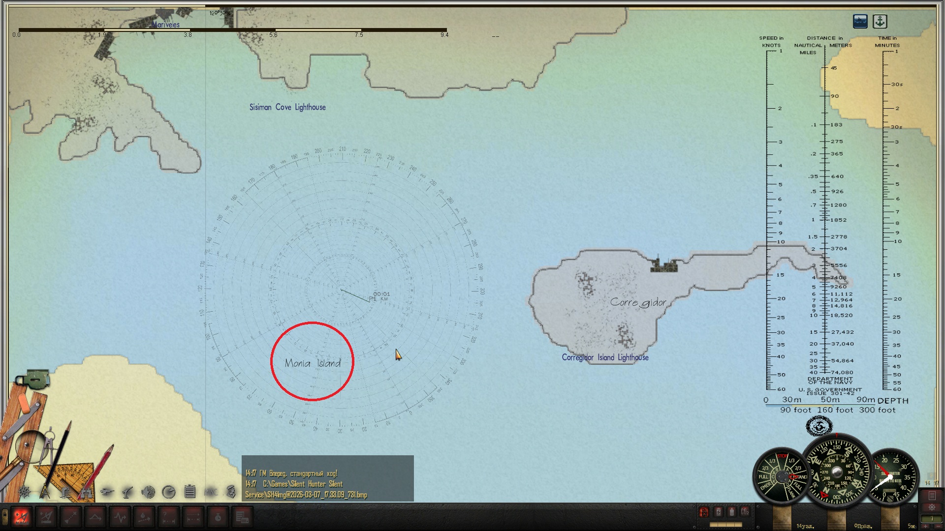 Днём иду к выходу из Токийского залива, а на ночь отхожу так, чтобы до ближайшего порта более 50 км. было. По времени сохраняюсь всегда за полночь (на скринах с приборами 03:05, а сколько было в первый раз, как приборы глюканули - я не помню). Вахта ни о каких контактах вокруг не докладывала, а сам я не проверял, может и был кто, не знаю. Может из-за сохраненок? У меня все сохранёнки с начала похода были, 12 или 13 штук, я их не удалял, хотя вспомнил потом, что их подчищать надо вроде.