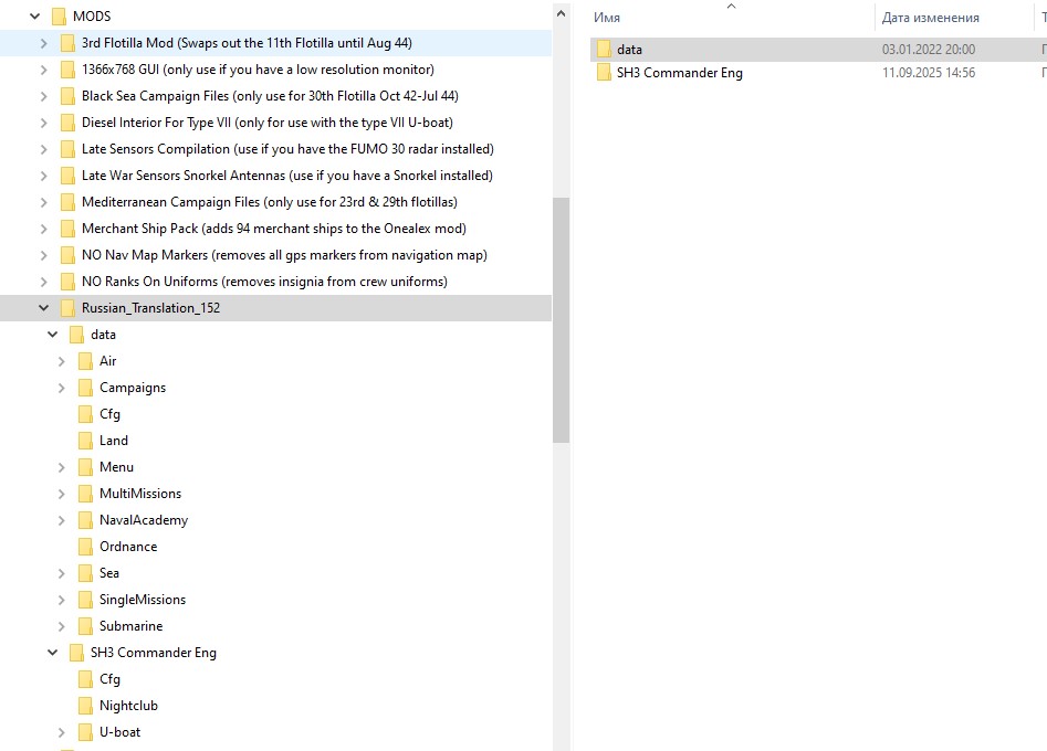 Должно быть так D:\SilentHunterIII\GWX Onealex Edition\MODS\Russian_Translation_152\data ,а не двойное название мода D:\SilentHunterIII\GWX Onealex Edition\MODS\Russian_Translation_152\Russian_Translation_152